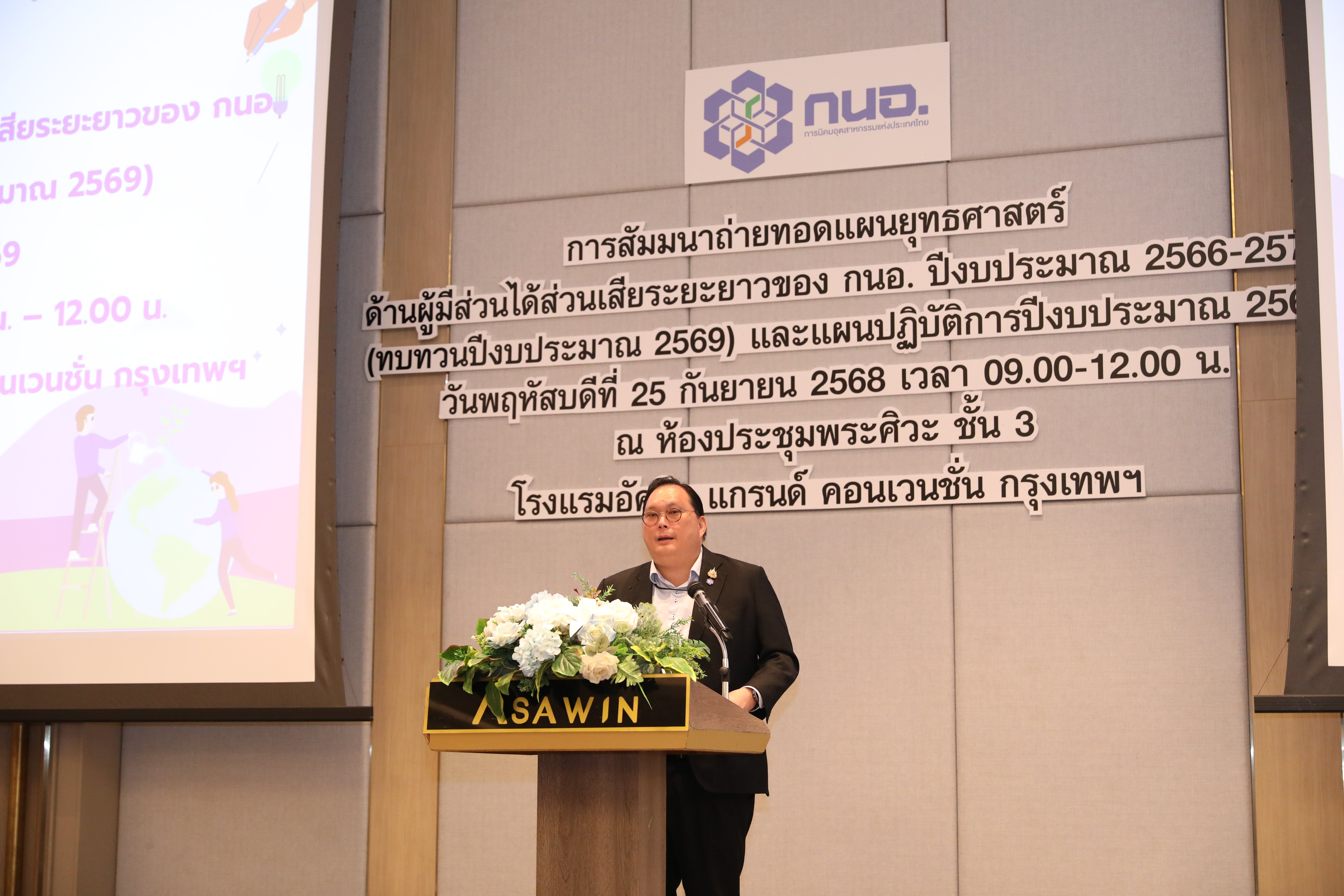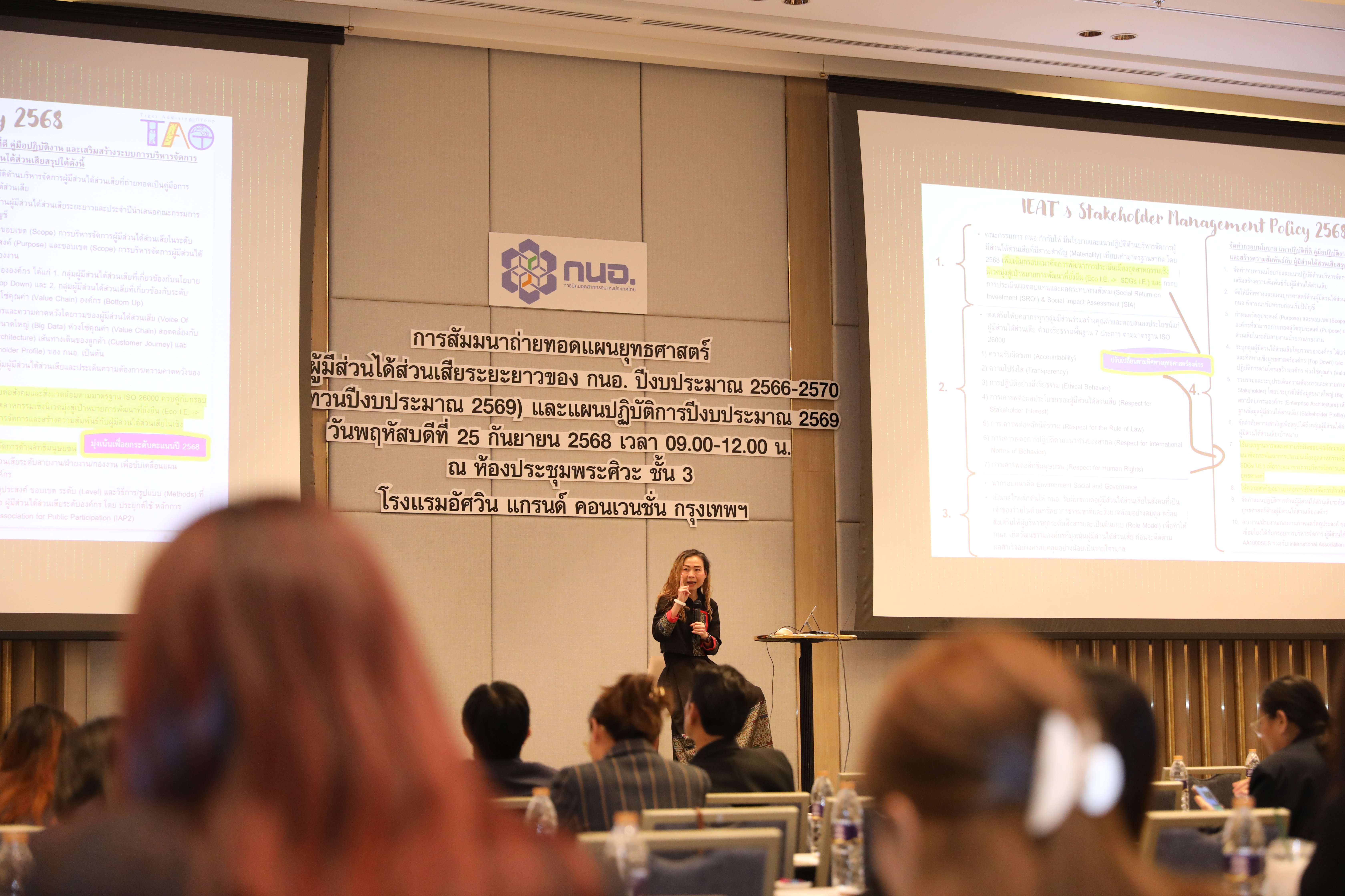วันพฤหัสบดีที่ 25 กันยายน 2568 เวลา 09.00 น. – 12.00 น. นายสุเมธ ตั้งประเสริฐ ผวก.กนอ. ให้เกียรติเป็นประธานกล่าวเปิดการสัมมนาถ่ายทอดแผนยุทธศาสตร์ด้านผู้มีส่วนได้ส่วนเสียระยะยาวของ กนอ. ปีงบประมาณ 2566 – 2570 (ทบทวนปีงบประมาณ 2569) และแผนปฏิบัติการปีงบประมาณ 2569 โดยมีนางบุปผา กวินวศิน รผก.พย. เป็นผู้กล่าวรายงานวัตถุประสงค์และมีผู้บริหารระดับสูงเข้าร่วมได้แก่ นายอนุชิต สวัสดิ์ ผช.ผวก.พย. ซึ่งการจัดสัมมนาในครั้งนี้ มีวัตถุประสงค์เพื่อสื่อสารแผนยุทธศาสตร์ด้านผู้มีส่วนได้ส่วนเสียระยะยาวของ กนอ. ปีงบประมาณ 2566 – 2570 (ทบทวนปีงบประมาณ 2569) และแผนปฏิบัติการปีงบประมาณ 2569 ให้ผู้มีส่วนได้ส่วนเสียรับทราบและสร้างความรู้ความเข้าใจในทิศทางและเป้าหมายในการบริหารจัดการและสร้างความสัมพันธ์กับผู้มีส่วนได้ส่วนเสียของ กนอ. และร่วมกันดำเนินงานอย่างบูรณาการ ให้เป็นไปตามกรอบหลักการที่ดีด้านการแสดงความรับผิดชอบต่อสังคมและสิ่งแวดล้อมในกระบวนการ ตามมาตรฐาน ISO 26000 และ ตอบสนองต่อประเด็นความต้องการและความคาดหวังของผู้มีส่วนได้ส่วนเสียตามหลักการด้านการบริหารจัดการผู้มีส่วนได้ส่วนเสีย AA1000SES โดย กนอ. ได้เรียนเชิญวิทยากรจากบริษัท ไทเกอร์ แอดไวซิ่ง กรุ๊ป จำกัด ซึ่งเป็นผู้ที่เชี่ยวชาญที่มีความรู้ความสามารถด้านการประเมินและพัฒนาระบบการแสดงความรับผิดชอบต่อสังคมและสิ่งแวดล้อมในกระบวนการตามระบบประเมินคุณภาพรัฐวิสาหกิจ และมีประสบการณ์ในการประเมินและพัฒนาระบบให้กับหน่วยงานภาครัฐและวิสาหกิจอื่นหลายแห่ง และ มีผู้เข้าร่วมงานได้แก่ ผู้พัฒนานิคมอุตสาหกรรม ผู้ส่งมอบ ผู้บริหารและพนักงาน กนอ. รวม 120 ท่าน ณ ห้องประชุมพระศิวะ ชั้น 3 โรงแรมอัศวิน แกรนด์ คอนเวนชั่น กรุงเทพฯ